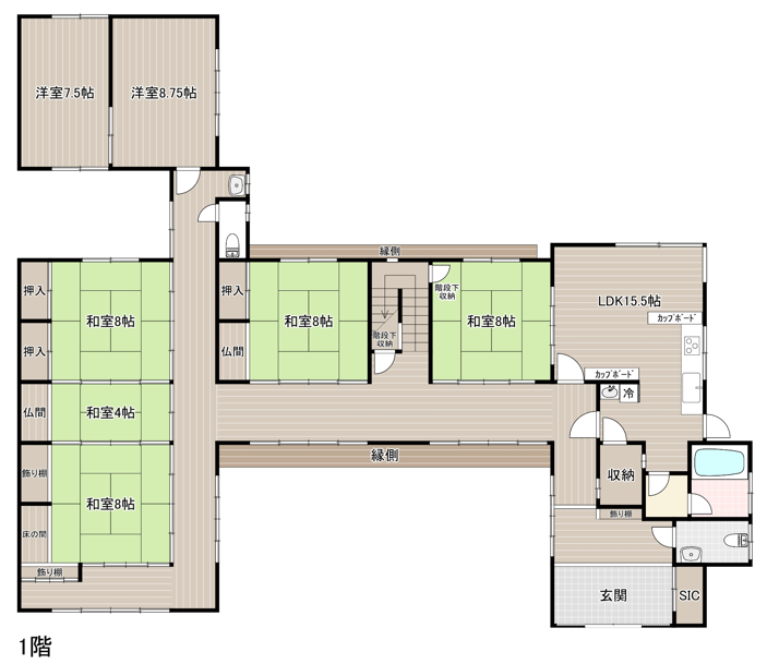 床面積:1階/208.60㎡ 2階/54.65㎡