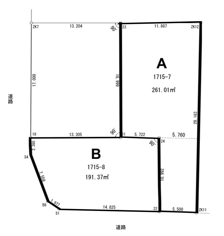 | 設備 | 上水道・下水道・都市ガス | 接道状況 | ※A区画:南側幅員約6mの公道に約5.5m接面 ※B区画:南側幅員約6mの公道に約14.8m接面 西側幅員約6mの公道に約11.8m接面 |